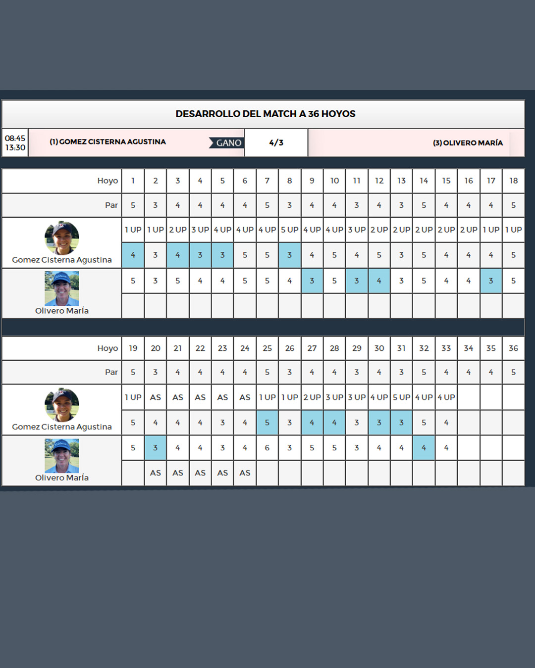 Se disputó el 130° Campeonato Argentino de Aficionados y 120° Campeonato Argentino de Aficionadas en Pilará Golf Club y contó con una destacada participación de representantes de la FRGS. María Olivero, de Palihue, obtuvo el segundo puesto en Aficionadas tras caer en el match play final. Se trato de 36 hoyos apasionantes y Olivero quedó sólo uno abajo en los primeros 18. En la última ronda, terminó los primeros 9 hoyos con dos abajo, aunque estuvo en igualdad hasta el hoyo 24. Finalmente, en los últimos 9 no pudo torcer la historia y Gómez Cisterna quedó 4up en el hoyo 32 y se quedó con el Campeonato.